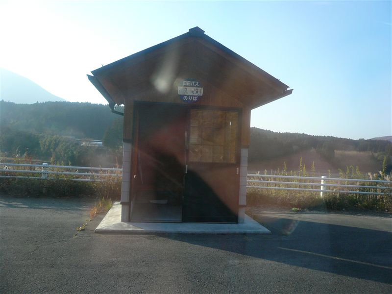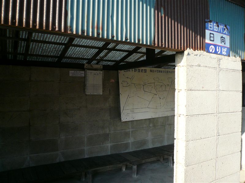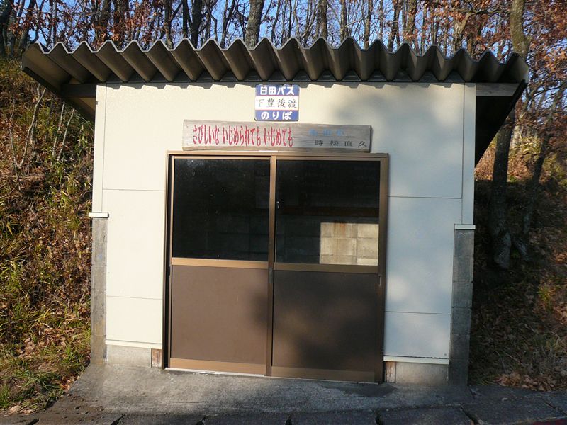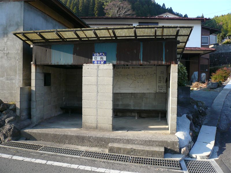 最終目標は久留米附設中学で、合格していたらホリエモン氏と同級生になりました。 昨今彼の自伝が出版されましたが、結局別の中学に行った僕と同じく、な友人が本の中に出てきます。ちょっぴり自慢、でもぼくは彼の生き方や言動は非共感的ですね、ミーハーみたいに持ち上げておいて申し訳ないですが…。 ぼくの軒下バス停との邂逅は、その中学受験塾の合宿です。 合宿の息抜きで、小学校のグラウンドに野球をしに出かけることがありました。 その場所がまさに軒下バス停「湯坪」。 これが現在の湯坪バス停。軒下にしていた商店の廃業で今は小学校の敷地内に待合室があります。 「日向」は当時のままです!! 堅牢な待合室型バス停が続くのですが、この路線は観光路線というよりか現在は学校輸送がメインです。もちろん小学校当時は、観光半分、学校輸送半分だったのでしょうが。 待合所を新設した「久保」、学校の標語が入った「下豊後渡」なんかからは、今でも子供たちの乗り場なんだなーという雰囲気が。 そんな筋湯温泉から少し下ったところにある、飯田高原という広い盆地。その中心街にあるのが大ボスの「下組」。 これを見て塾の同級生が「執念のバス停やな」「バラバラや」と次々声を挙げたのを覚えています。 豊後中村駅から是非乗りバスで登ってみる事をおすすめします。 終点近くにはこんな大ボスが眠っていますしね・・・。