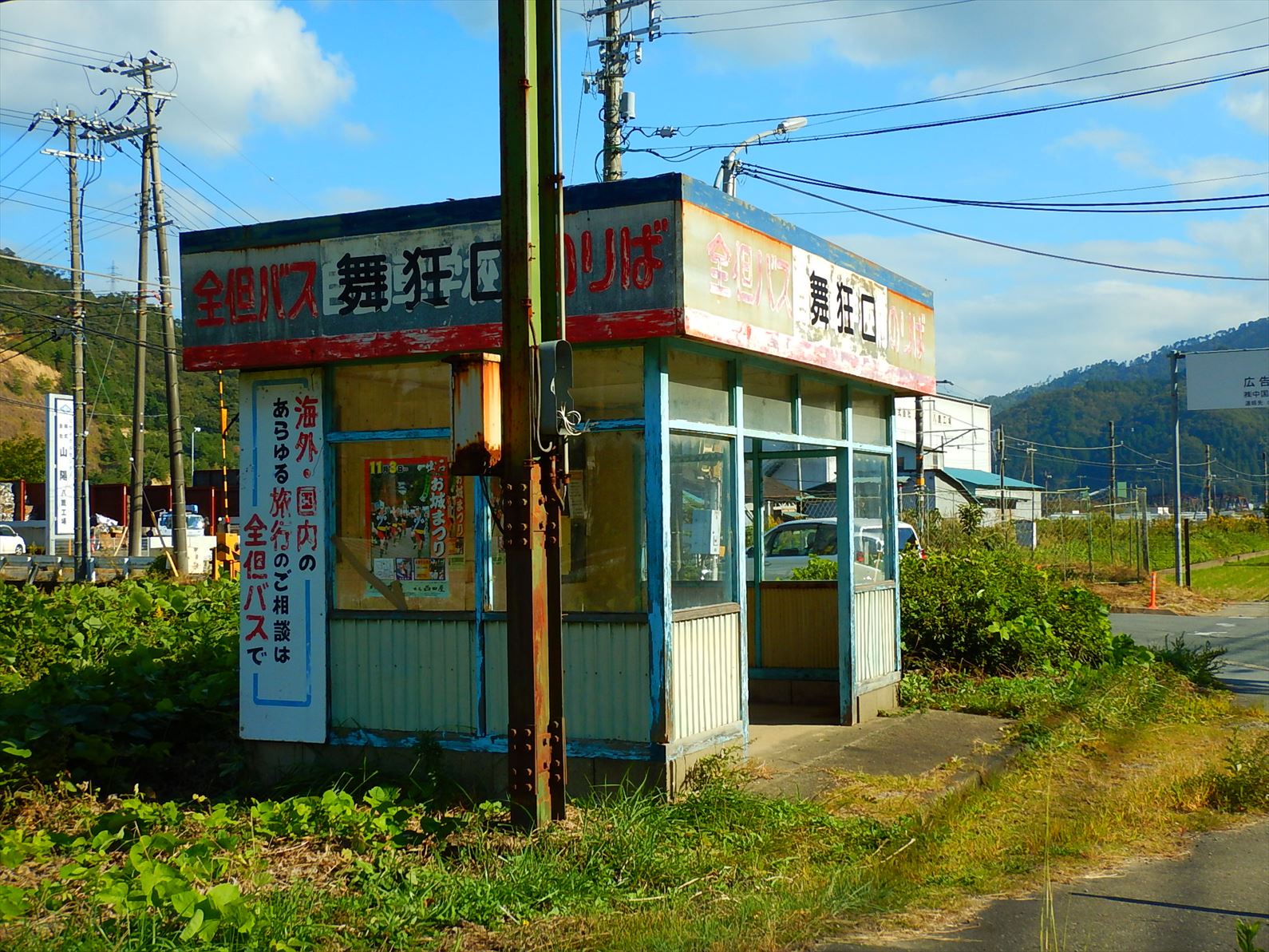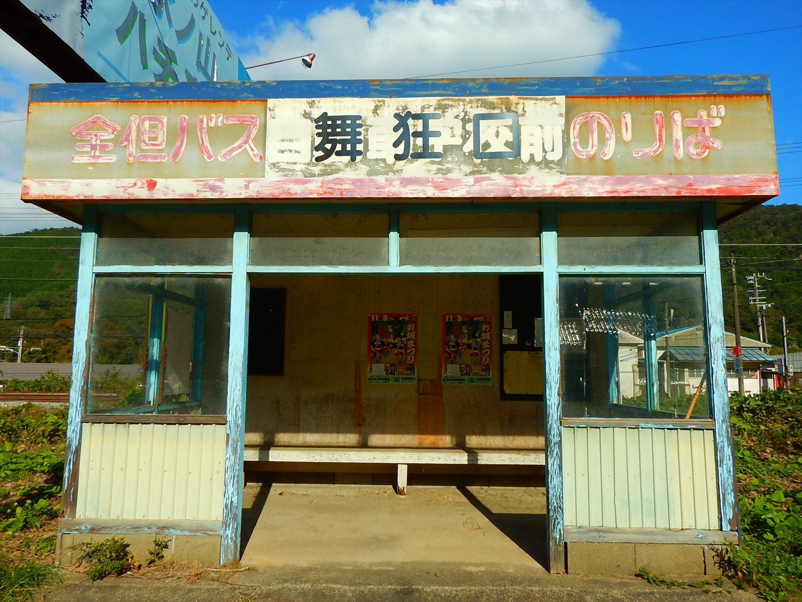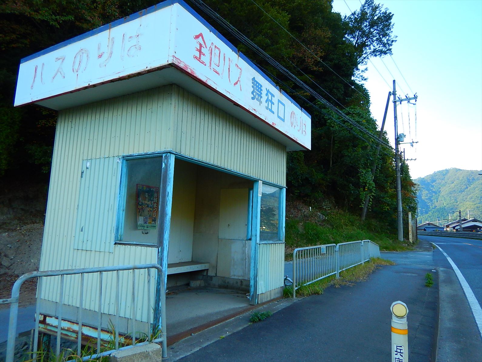 「舞狂」という地名に当たっておったまげました。 バス停はその集落の対岸。 陰陽師たちが住む集落であったのが由来だそうで、それにしても「舞に狂う」とは。 今は静かな集落のようだけど、 この名前、とてもインパクトある。 しかもご丁寧に上り下りと別々に、このインパクト小屋があってね。 調べてみると今も大字舞狂。 軽く調べてみると結構な場所で、「時の為政者がはるばるこの地を訪れていた」とか伝承が残っているようで…ひょっとしたら今も続いているのかも?